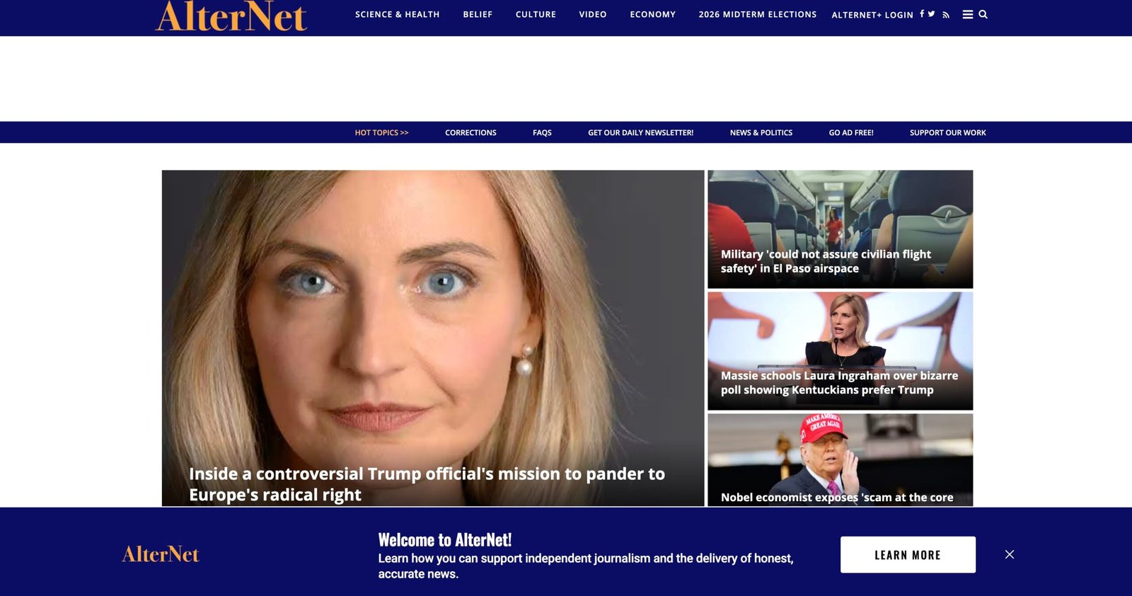 AlterNet is an online progressive news and opinion site that publishes original reporting, investigative pieces, analysis, and strongly-voiced commentary on politics, social justice, environment, civil liberties, and culture. Its audience tends to be politically engaged readers interested in progressive perspectives and investigative reporting.