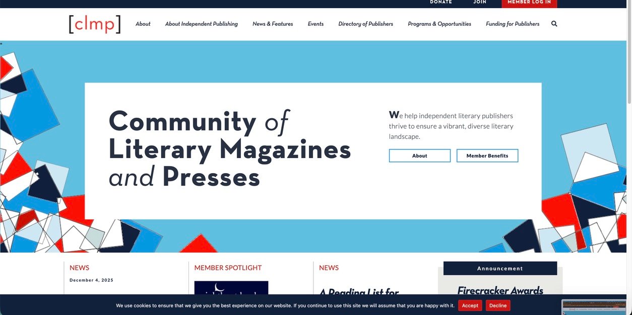 The Community of Literary Magazines & Presses (CLMP) is a membership organization that supports independent literary magazines and small presses — and collects information that helps writers find opportunities, submission windows, and publisher contact points. See the CLMP homepage for context and mission details. CLMP.org.