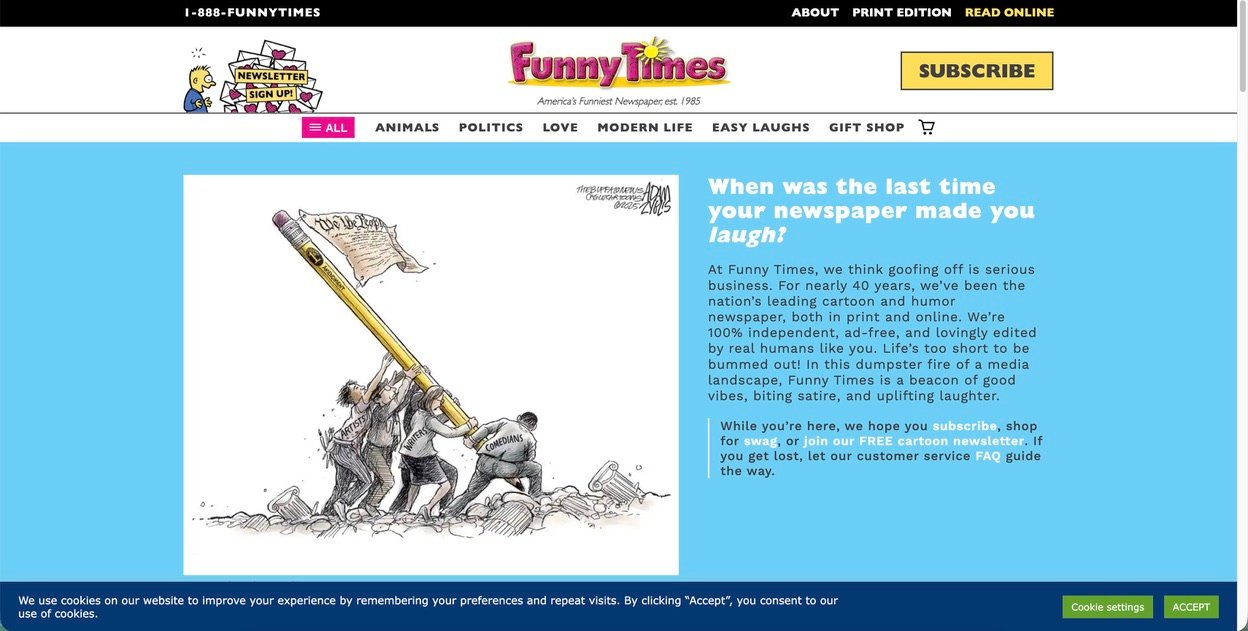 Funny Times is a monthly humor newspaper and website that curates cartoons, short humor essays, satirical lists, and comic strips that poke fun at politics, everyday life, relationships, work, and culture. The tone is often observational, satirical, and accessible to a wide, adult audience. See the homepage for samples and the magazine’s mission. (Start at their homepage for immediate examples.)