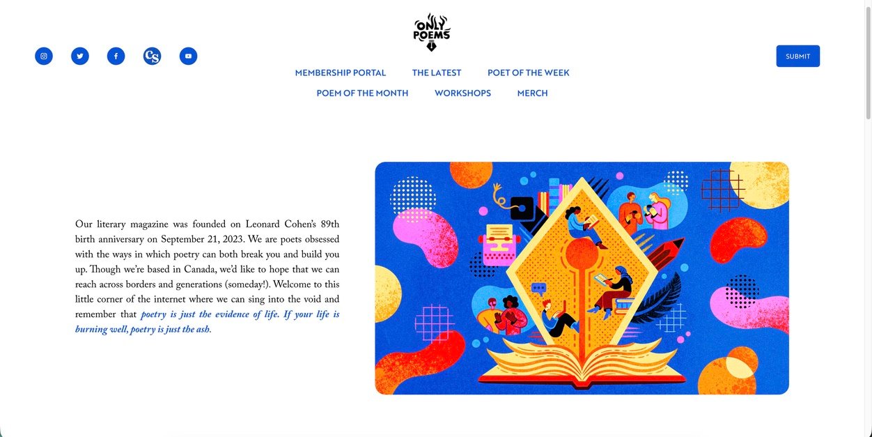 ONLY POEMS is a poetry magazine and online editorial project that publishes single poems, short collections such as “Poet of the Week” slots, monthly themed pieces (Poem of the Month), contests, and short-form daily poems via its daily project. The editorial mix includes essays on craft, interviews, reading lists, and workshop announcements. Editors often look for strong voice, craft, and a clear artistic decision in each piece.