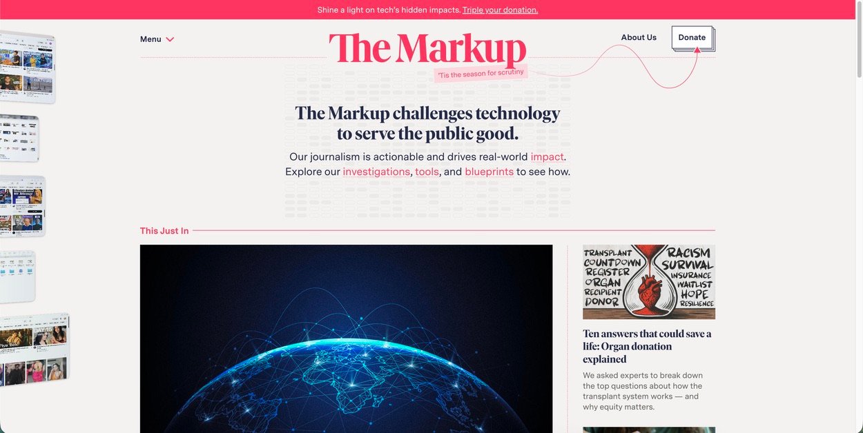 The easiest way to understand what a newsroom wants is to look at its navigation and story “families.” The Markup publishes investigations and tool projects such as Blacklight, Citizen Browser, and Pixel Hunt. These are not “articles” in the usual sense — they are projects that mix software, data, and storytelling.
