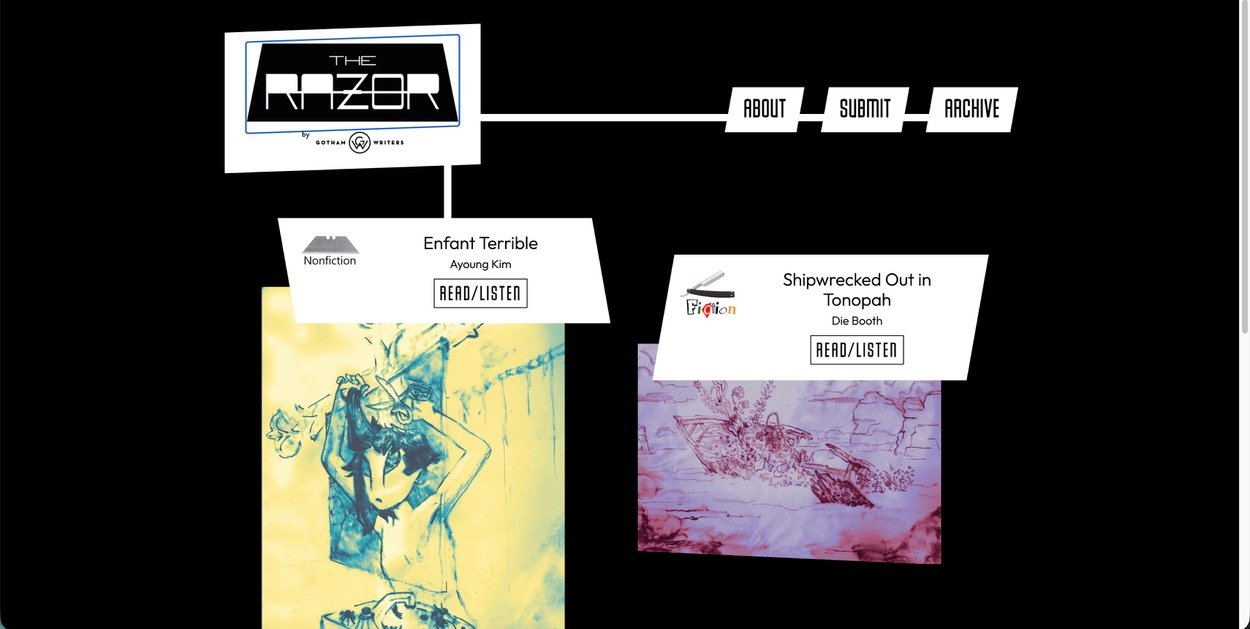 The Razor is a literary magazine produced by Gotham Writers Workshop. It publishes short-form literary pieces — specifically, two pieces each month: one fiction and one nonfiction — making it a focused venue for short stories and creative essays. :contentReference[oaicite:1]{index=1}